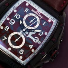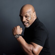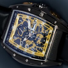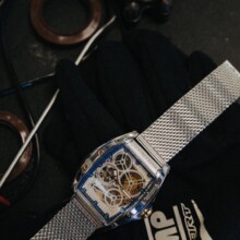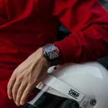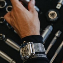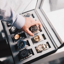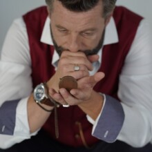 Man looking at his watch on the left hand with a ring on the little finger. In right hand he holding a glass of whiskey.