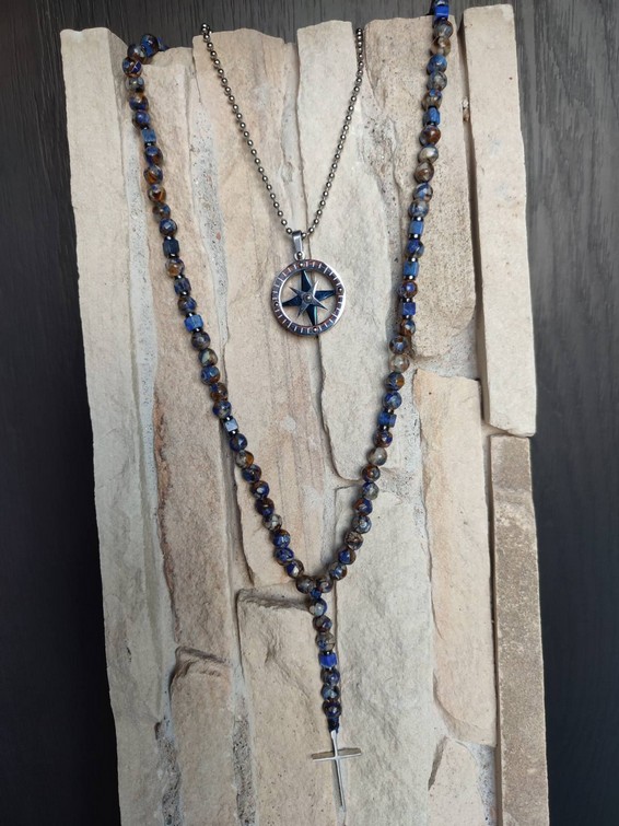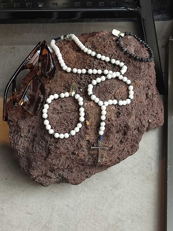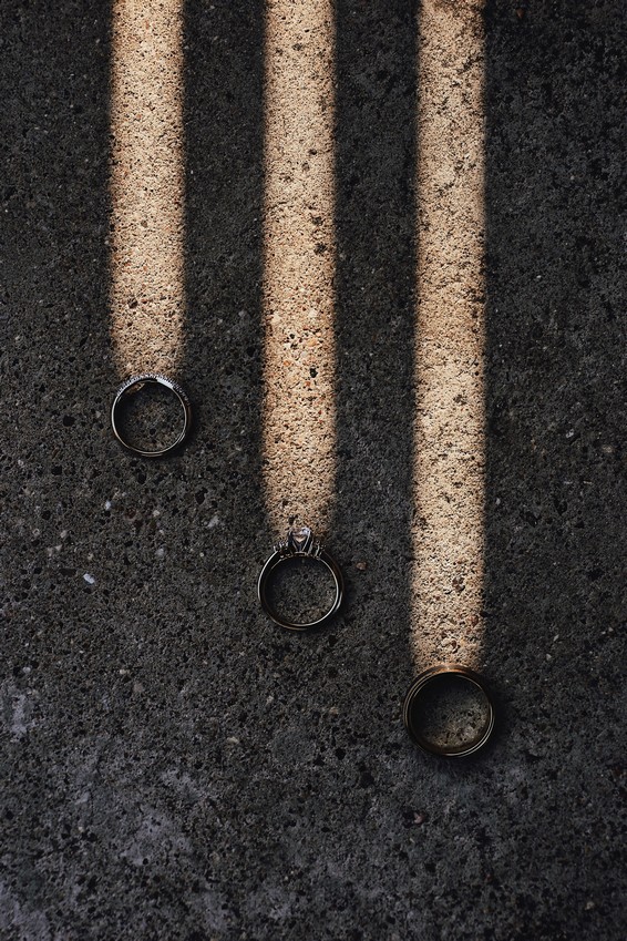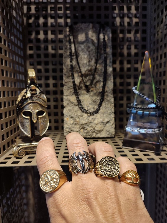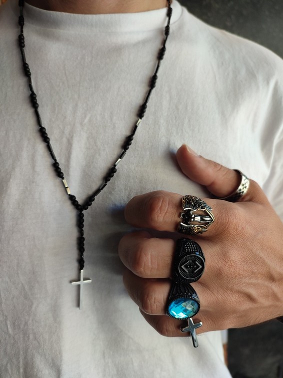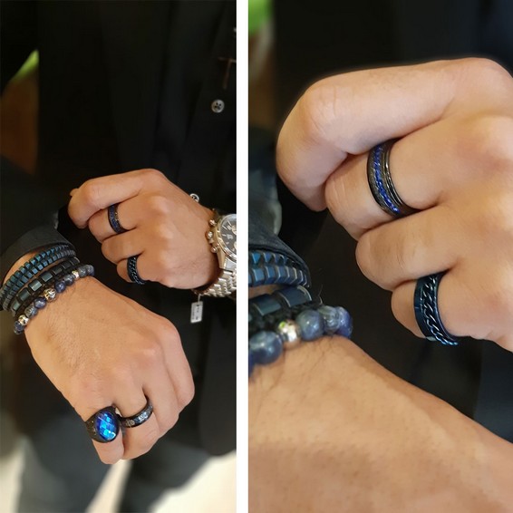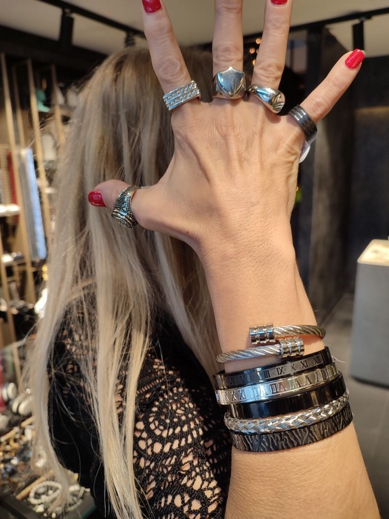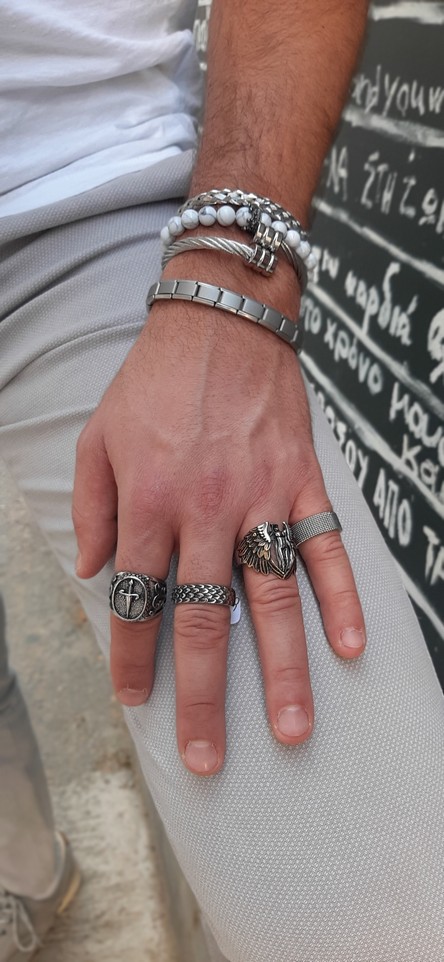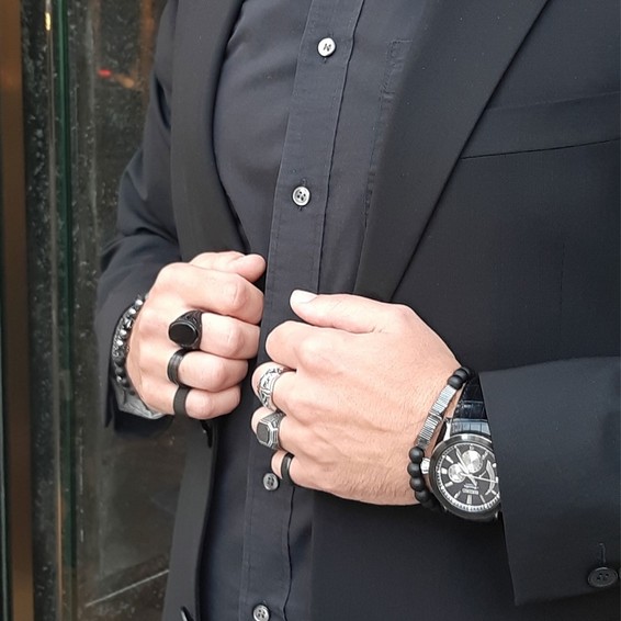 Close up in male hands with silver jewelry