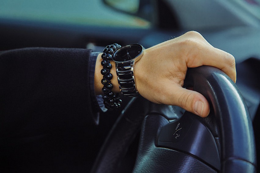 Color image of adult male hand with watch and bracelet in car. Close up photo.