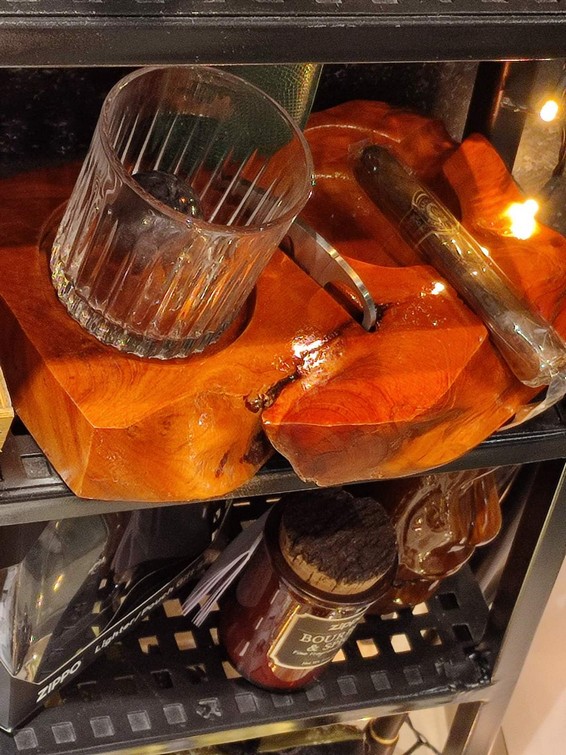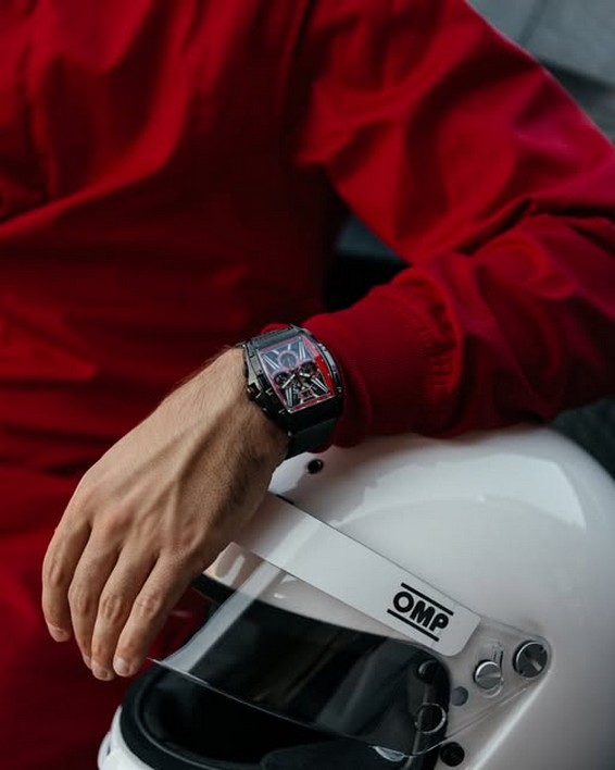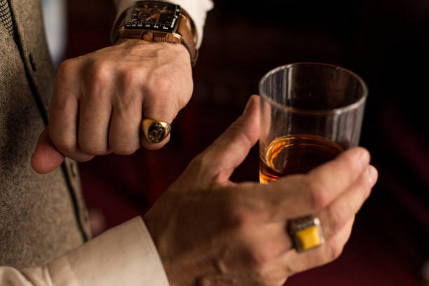 Man looking at his watch on the left hand with a ring on the little finger. In right hand he holding a glass of whiskey.
