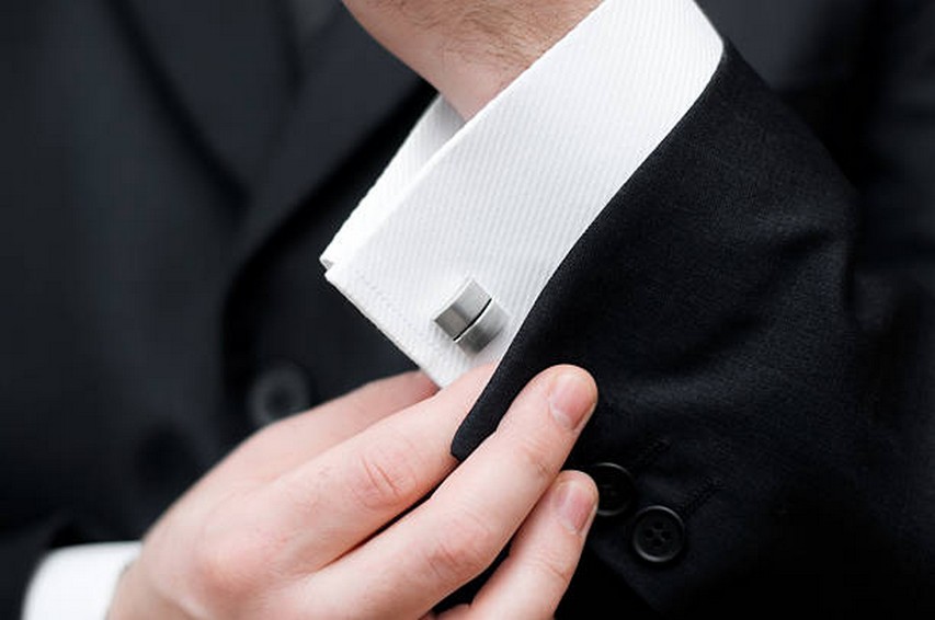 elegant young fashion man fixing cufflinks