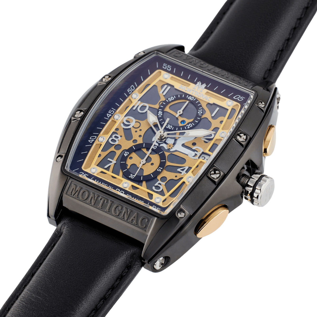 Εξ ολοκλήρου μαύρο με χρυσό μοτίβο σκελετού στο καντράν, το ρολόι MOW903 tonneau διαθέτει σχεδιασμό που είναι συγκρατημένο και μοντέρνο. Σχεδιασμένος και συναρμολογημένος στη Γαλλία, αυτός ο χρονογράφος από χαλαζία είναι εξοπλισμένος με ιαπωνική κίνηση και προβάλλει τρεις αναλογικούς δείκτες, καθώς και λειτουργία χρονογράφου και ένδειξη ημέρας/ημερομηνίας. Αυτό το μοντέλο περιλαμβάνει μια βιδωτή κορώνα.