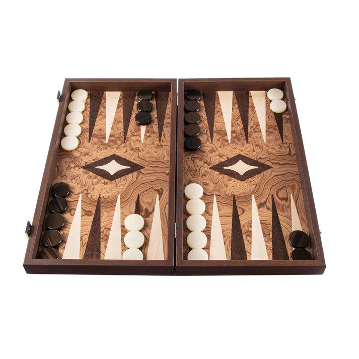 • Premium καρυδιά: Φτιαγμένο από καρυδιά, ένα δέντρο γνωστό για το συμβολισμό της αυτοπεποίθησης και της διανοητικής σοφίας, το σετ τάβλι διαθέτει εγκάρδιο ξύλο με εκπληκτική γκάμα από ανοιχτό ανοιχτό καφέ έως σκούρο καφέ σοκολάτα, διακοσμημένο με πιο σκούρους κυματιστές κόκκους.